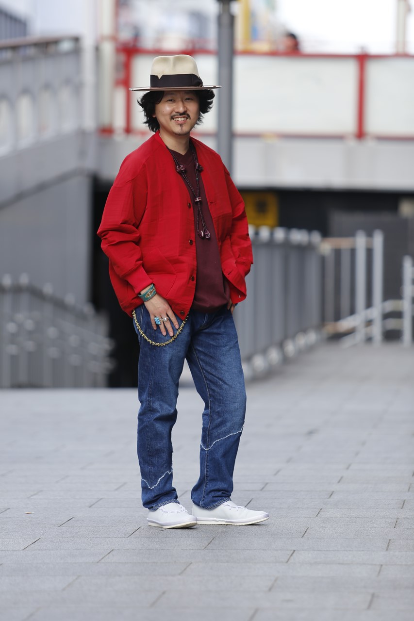 インパクトのある赤いカラーを際立たせたデニムスタイルを見せてくれた松尾さん。ヴィンテージやアーティストモノなどの様々なデザインのインディアンジュエリーや、ハットなど、個性的なともマッチするデニムの懐の深さを感じるコーディネイトだ。