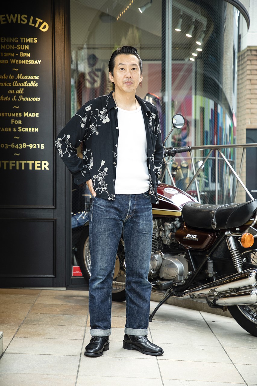 コーディネイトが難しい和柄のハワイアンシャツをタイトフィットデニムとルイスレザーズのライディングブーツで、バイク乗りの後藤さんらしい印象に。インナーにクルーネックTを着て、シャツを開けているのも、こなれて見える理由のひとつ。