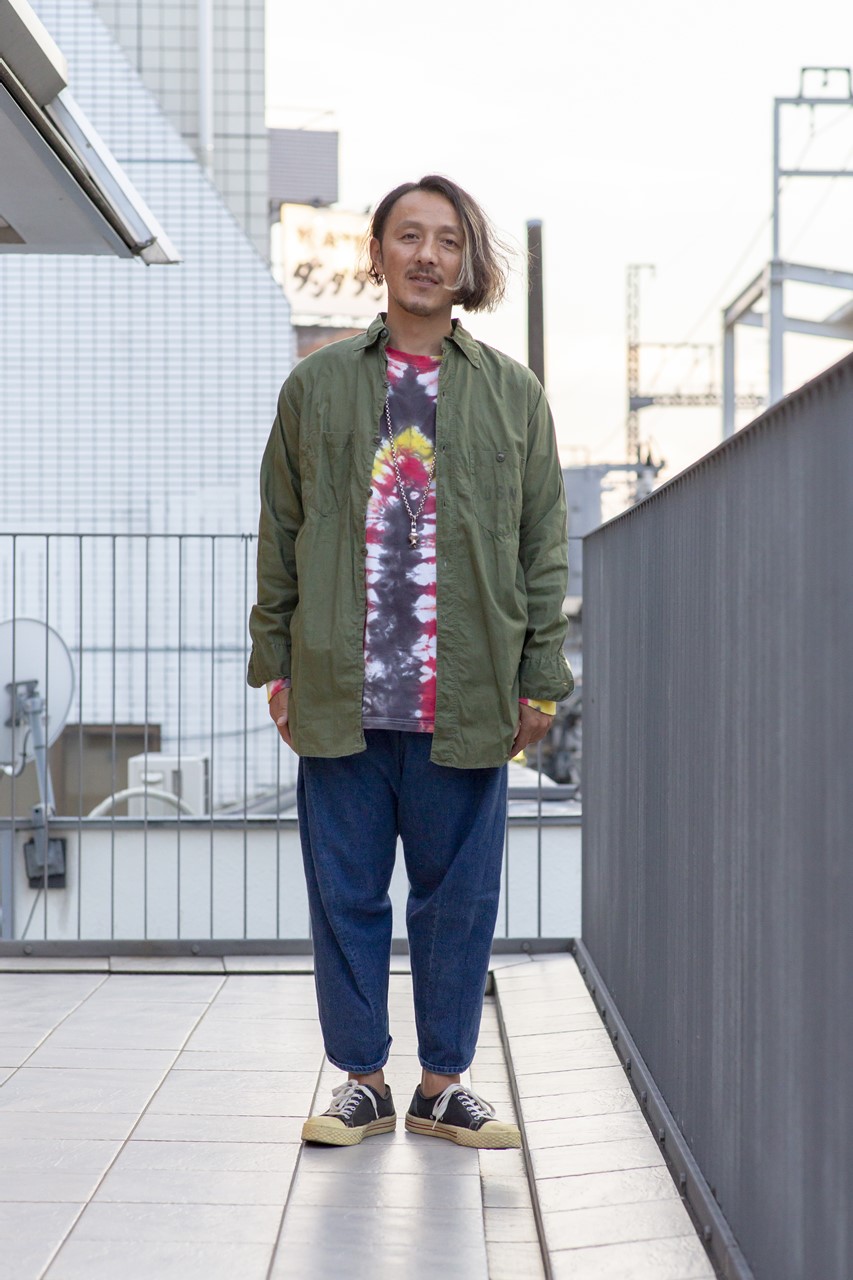 ワークウエアを思わせるようなバレル型のバギーデニムパンツをUSネイビーのシャツとタイダイのTシャツでうまくまとめたスタリング力がお見事。大きめのサイジングやカラーリング、古着の取り入れ方など、大人が参考にしたい要素が多数。
