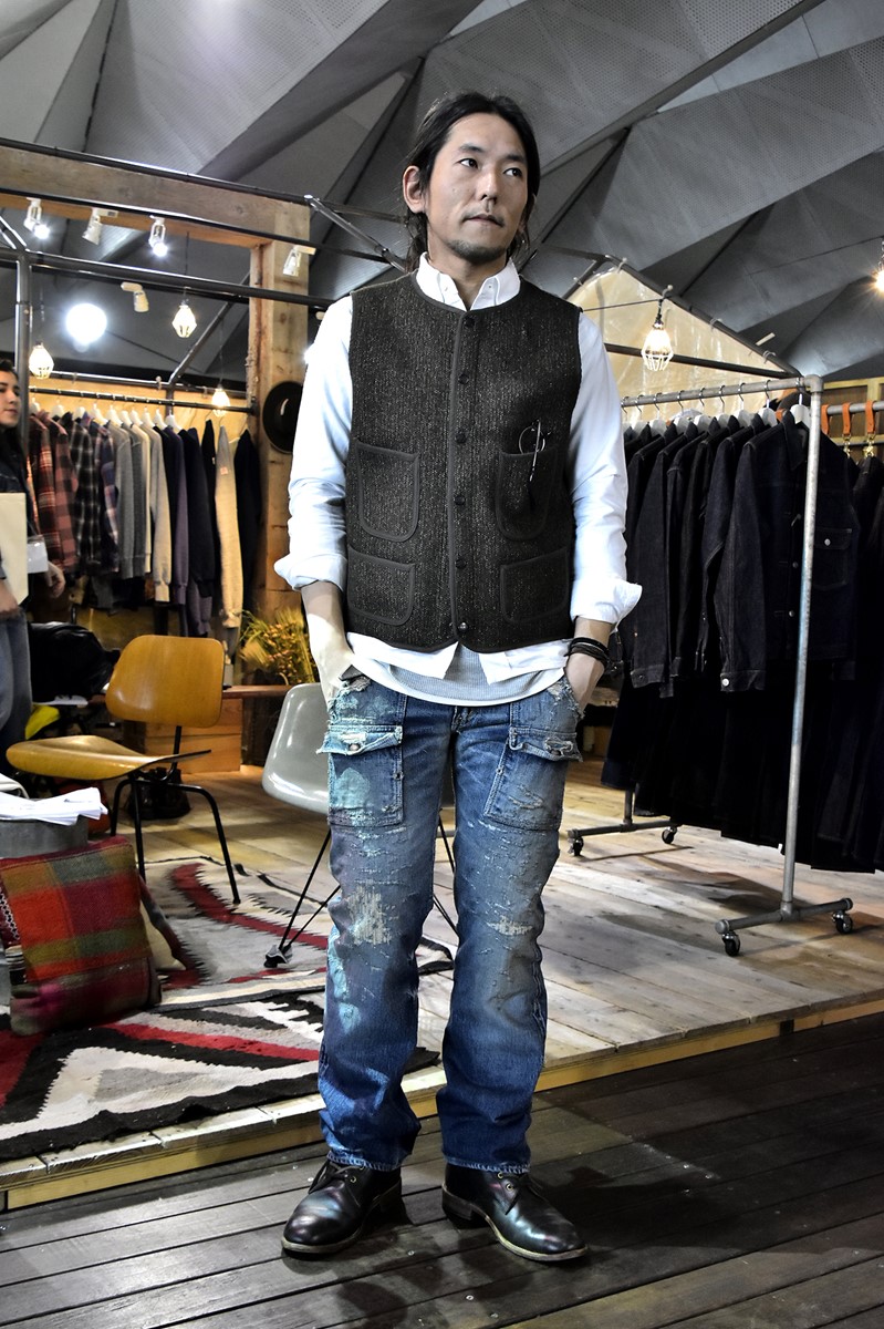 もはや定番ともいえるフルカウントのブッシュパンツ。かなり穿きこまれた雰囲気をもつ「フルカウント東京店」店長・手塚秀博さんの一本。激しくリペアした生地はフルカウントが手掛ける13.7オンスでリアルな表情。めくれ上がったフラップポケットも穿きこんだ表情を生み出している。