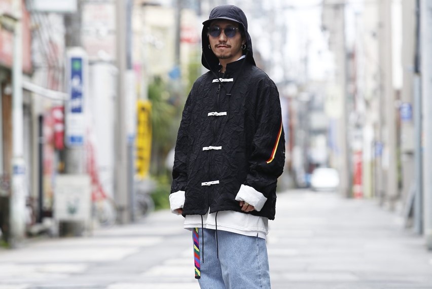 全身をオーバーサイズのアイテムでストリート感のある服装に身を包んだ町山さん。パンチの効いたデザインのフォセッタズムのマオカラーチャイナジャケットを主役にコーディネイト。随所に散りばめられたカラフルな小物がアクセントに。