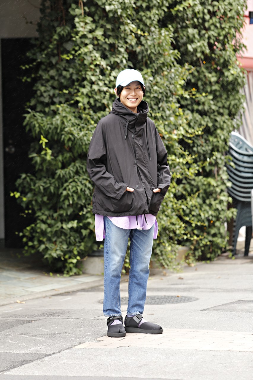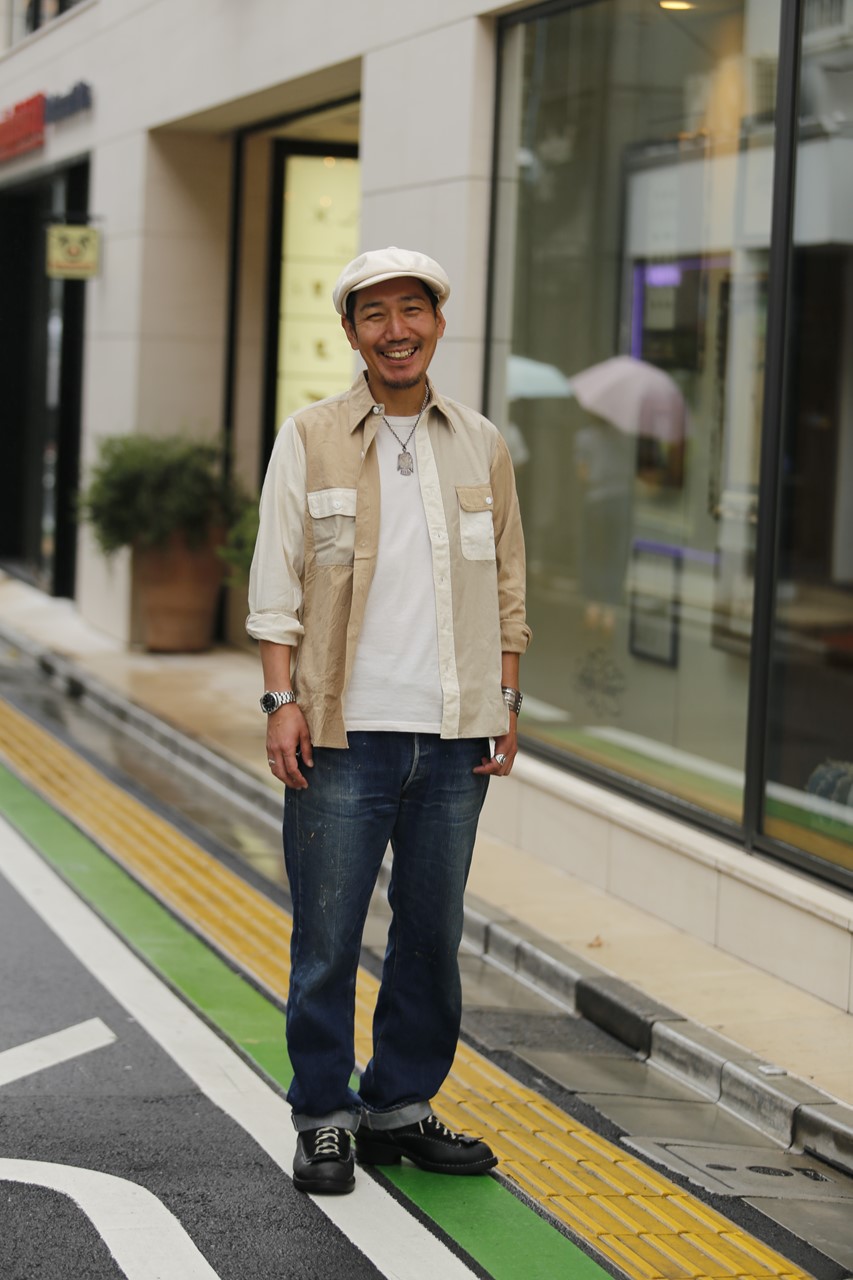 テアトラのジャケットやスイコックのシューズなど、ヴィンテージ色の強い5ポケットパンツに、あえてスポーティな要素をミックスしたモダンなコーデ。ビッグシルエットのシャツをインナーに合わせることで、さり気ないアクセントになっている。