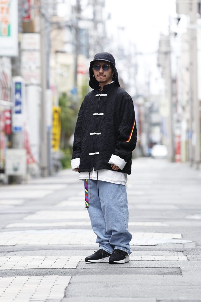 全身をオーバーサイズのアイテムでストリート感のある服装に身を包んだ町山さん。パンチの効いたデザインのフォセッタズムのマオカラーチャイナジャケットを主役にコーディネイト。随所に散りばめられたカラフルな小物がアクセントに。