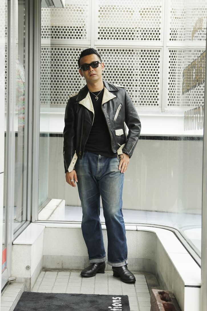 王道のライダースジャケットに5ポケットデニムというスタイル。それでも西崎さんらしさが全面に出ているのは、2トーンのライダースのチョイスとオーバーサイズで穿いたデニムパンツの着こなしがあるから。