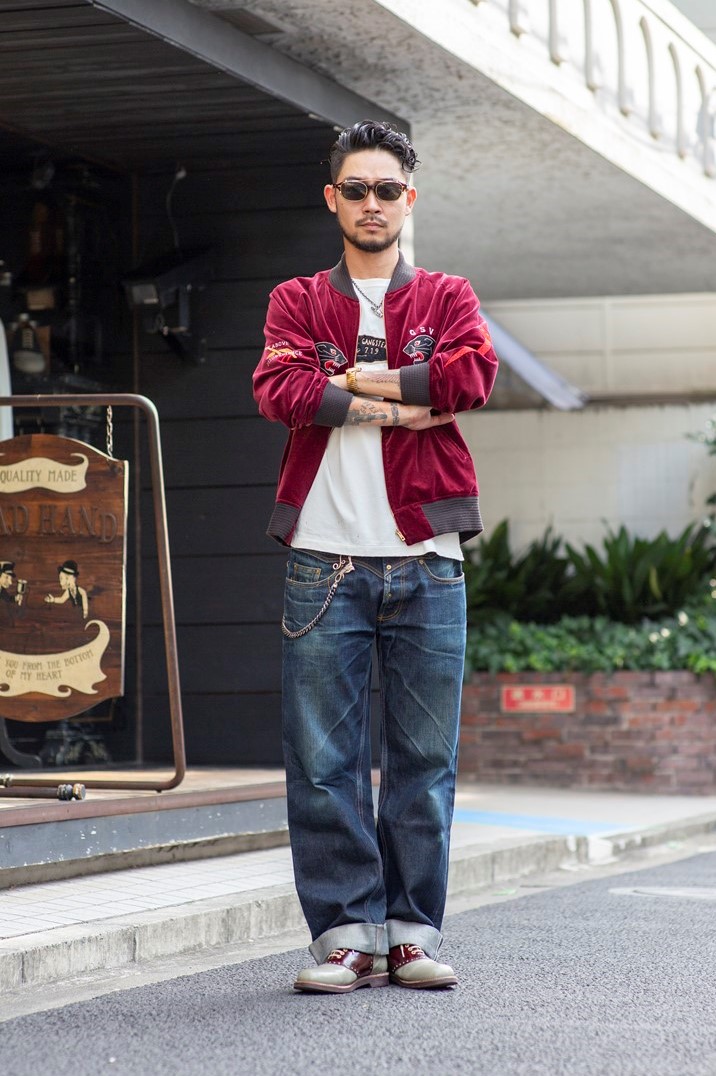 ギャングスタービルのスカジャンに、5年ほど穿いているアイアンクロスデニムをプラス。ほどよくジャストフィットのトップスに、太めのストレートシルエットという組み合わせがバランスよし。小物使いも秀逸だ。