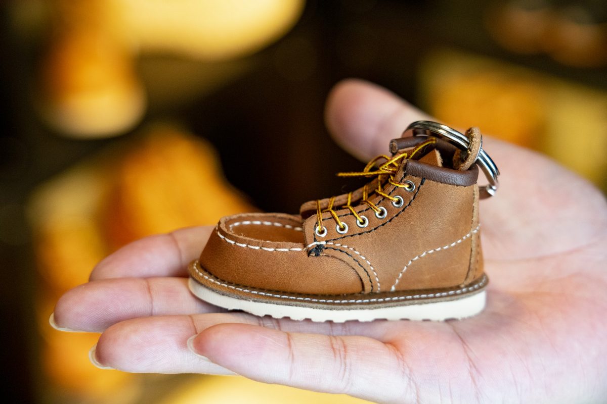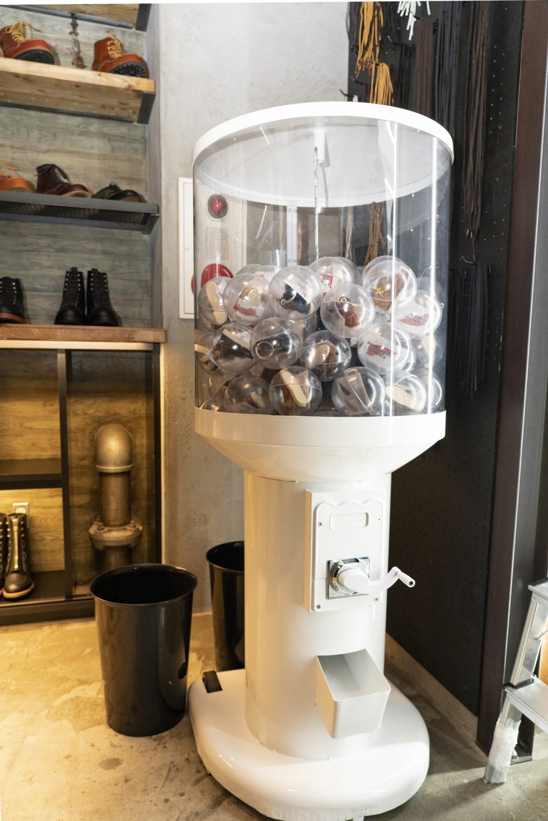 “RED WING ICON NIGHT”では、来場したプレス関係者に特別なカプセルギフトが用意されていた。実物同様のデザインで作られた、レッド・ウィングを象徴するモックトゥブーツのキーホルダーで、定番モデルである#875など4種類を用意。コインを投入しハンドルを回すとその4種類のいずれかを入手できた。もちろん非売品。