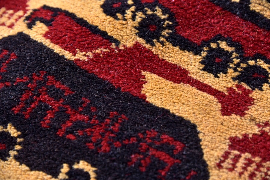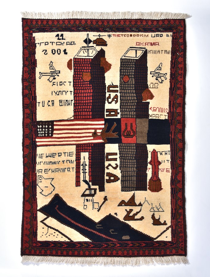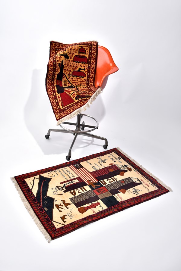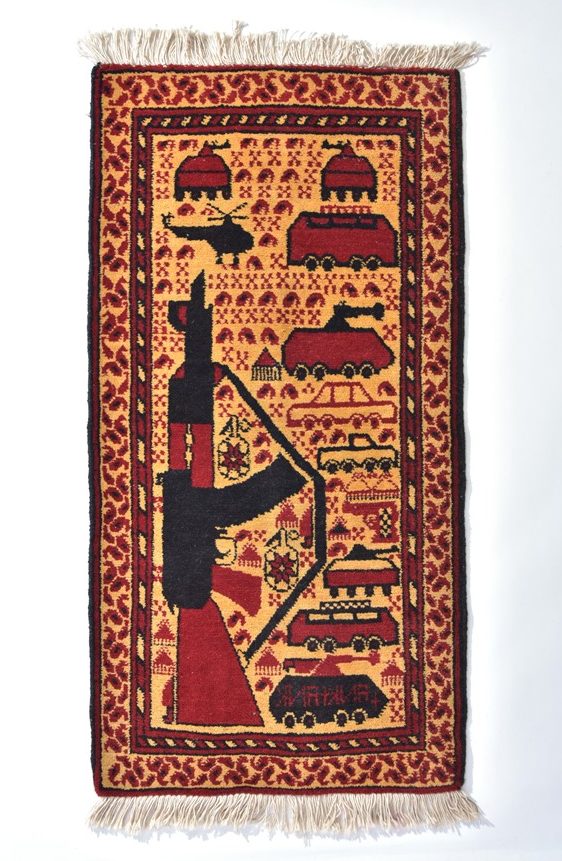 それは「ウォーラグ」と呼ばれるアフガニスタン製の手織りラグ。モチーフは突撃銃や戦車などの兵器、戦争の事象など。このラグが誕生したきっかけは、ソ連軍によるアフガニスタン侵攻がきっかけだという。でもこれは戦争賛美の織物ではなく、むしろ戦争を批判するために、織られたもの。