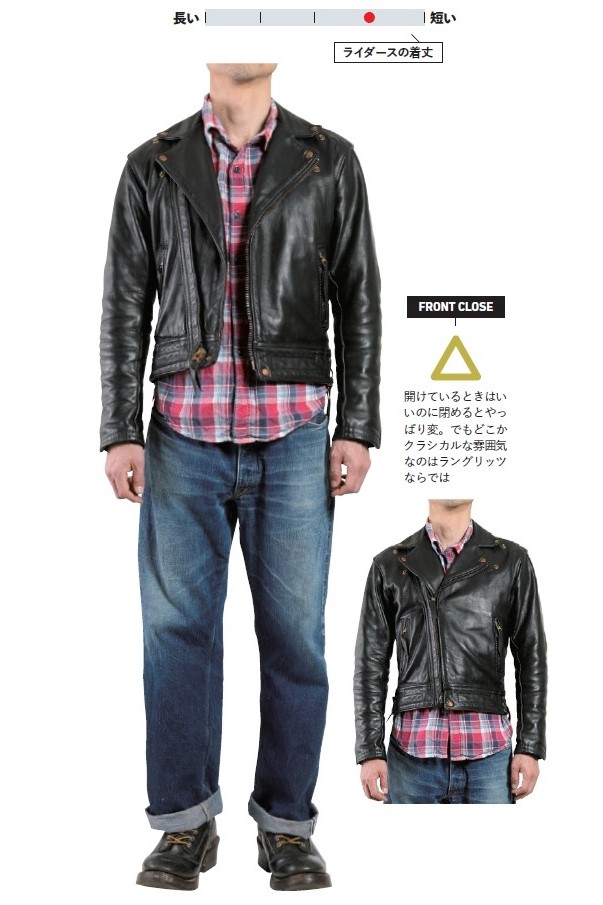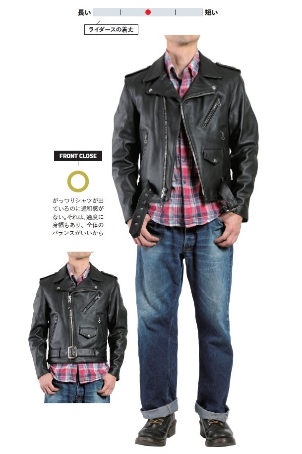 革ジャンラバー代表・編集部モヒカン小川的には、ワンスターの着丈が“ライダース標準時” である。これを基準として着丈の長い・短いを判断するわけ。事実、コレくらいの着丈のライダースって多い気がする。これを基準にインナーの丈を決めてみては?