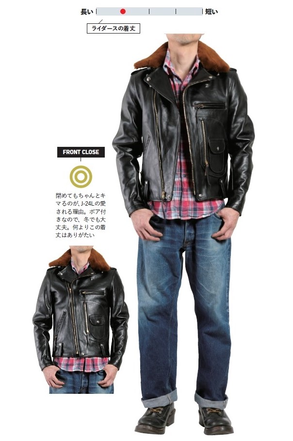 定番BUCO J-24の着丈を、ちょっと長くしたモデルがこのJ-24Lだ。LはLongの意味って知ってた? ハード系のライダースの中では、抜群にいろんなインナーと合わせやすいのが特徴。本家より数センチ長いだけなのにね。