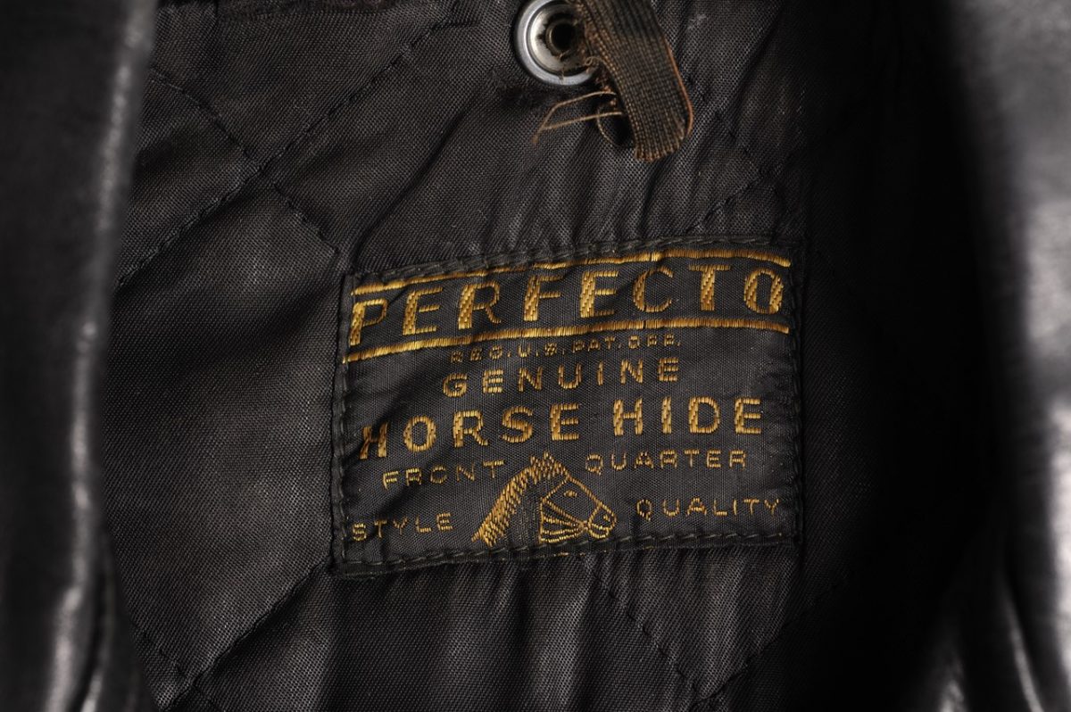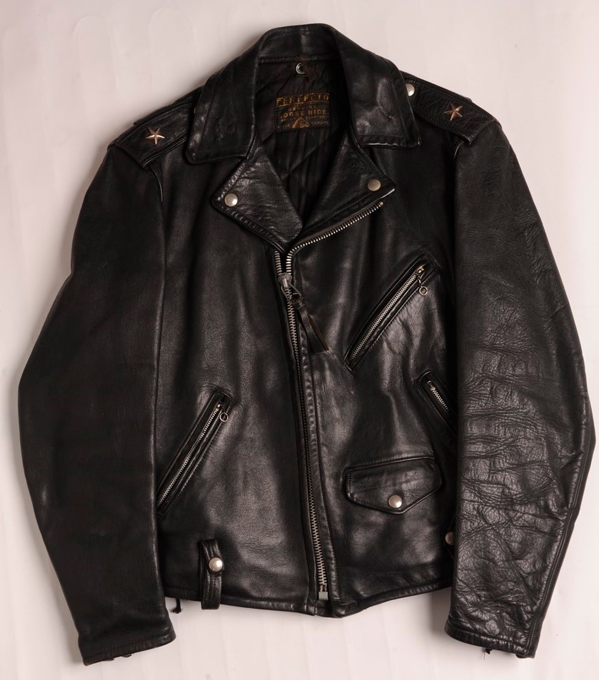’53年公開の映画『乱暴者』の影響でダブルライダースが脚光を浴びた時代。バイクに乗ることを想定したショート丈のシルエットで素材はホースハイドが多かった。この時代の『PERFECTO』タグには馬のイラストが描かれる。今のライダースの基本的な形はこの時代に完成していたことがわかる。