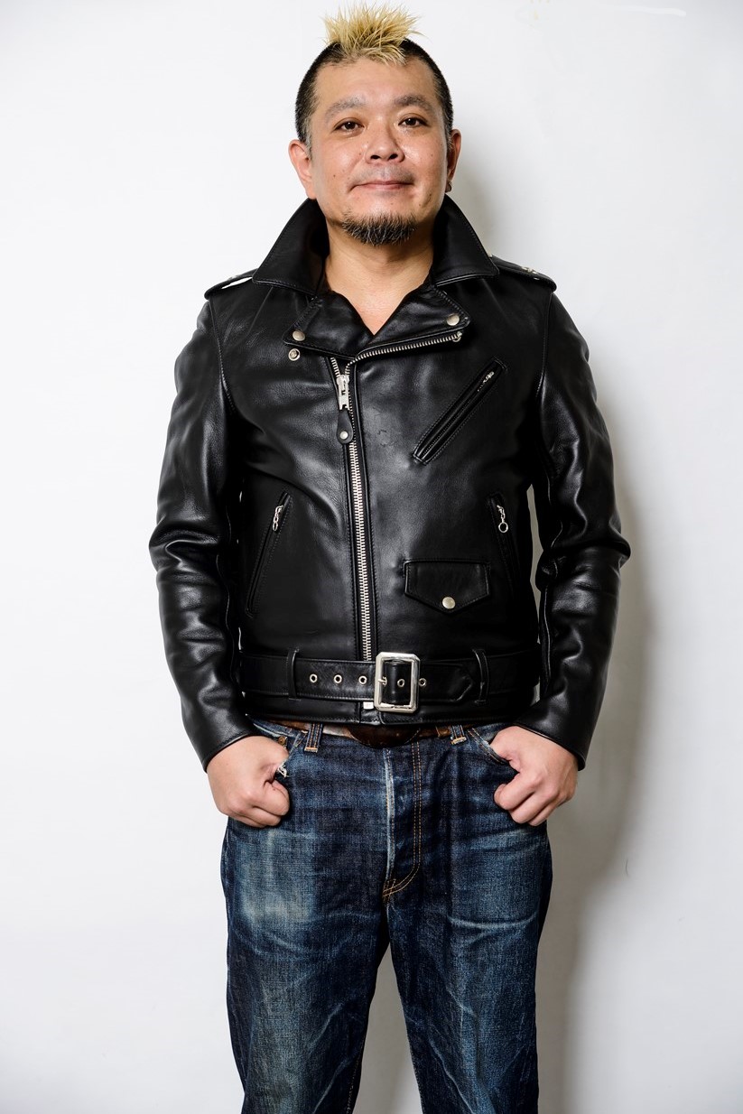 ライトニングのレザーラバー・モヒカン小川、48歳。酒のつまみは魚より革派。太すぎず細すぎずいわゆる中年男性の標準体型で、所有するライダースのサイズはほとんどが38