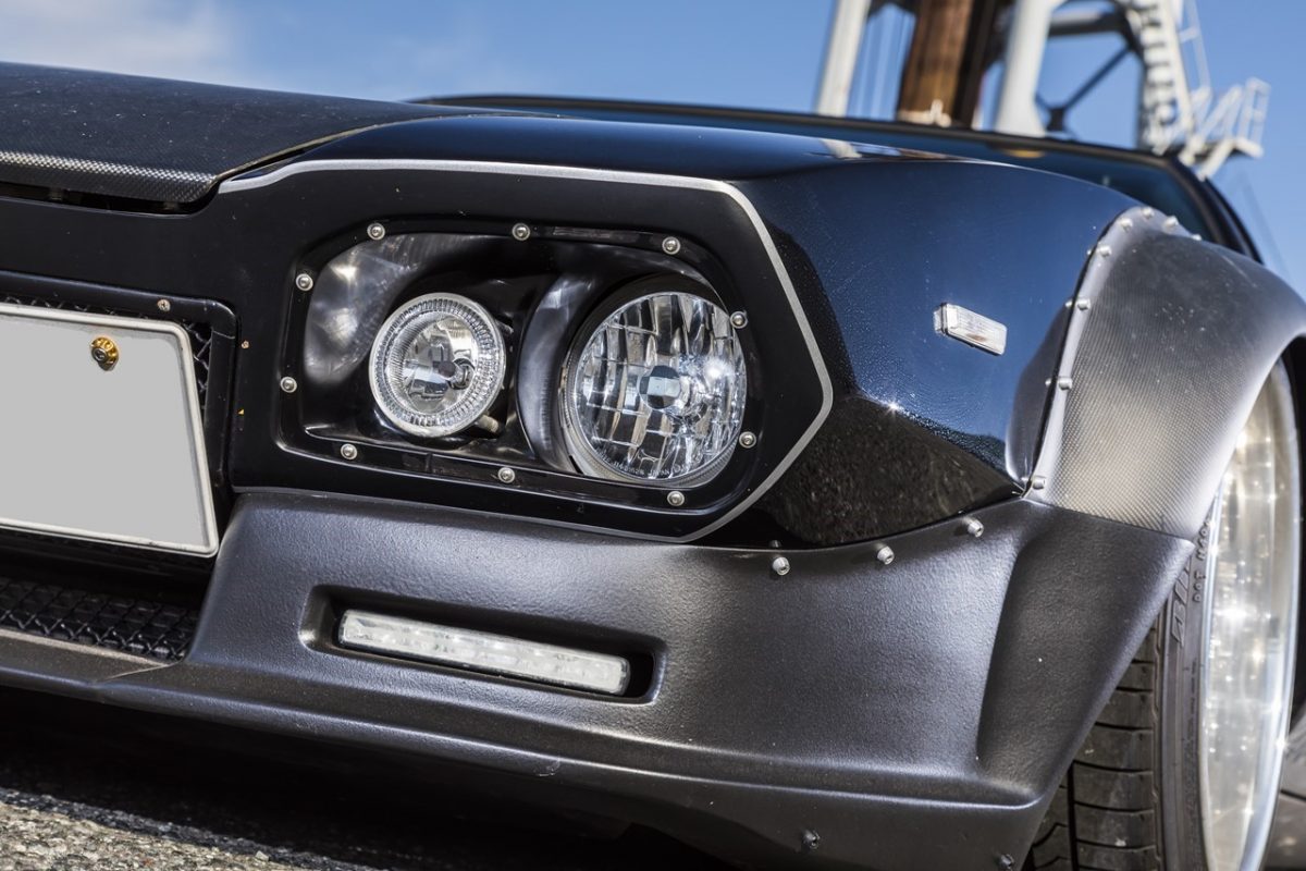 ヘッドライトは本来リトラクタブルだが、グリル内に埋め込んだ固定式ライトに変更。オーバーフェンダーはカーボンで製作したオリジナルパーツだ。