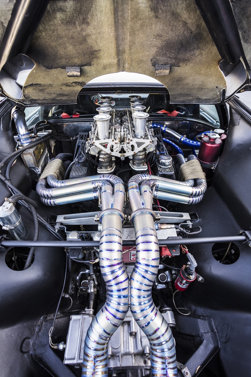FORD351クリーブランドをフルバランシング。8連FCRがレーシーな雰囲気。フルチタンのエキゾーストは排気干渉を意識してセンターで繋がる対称な作り。