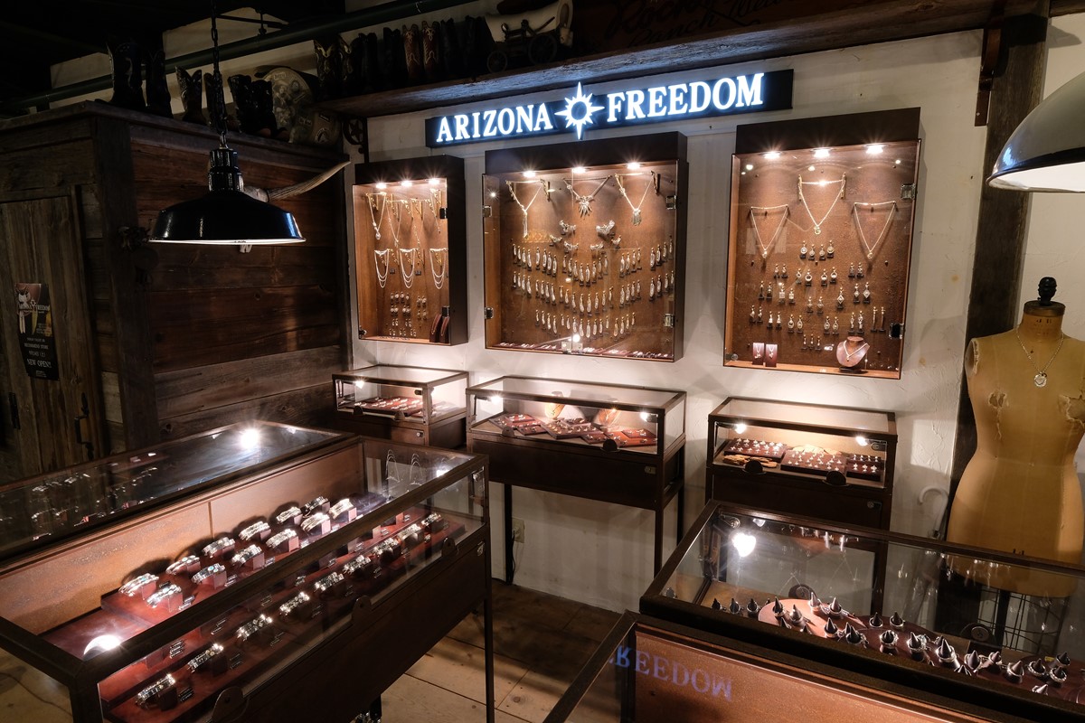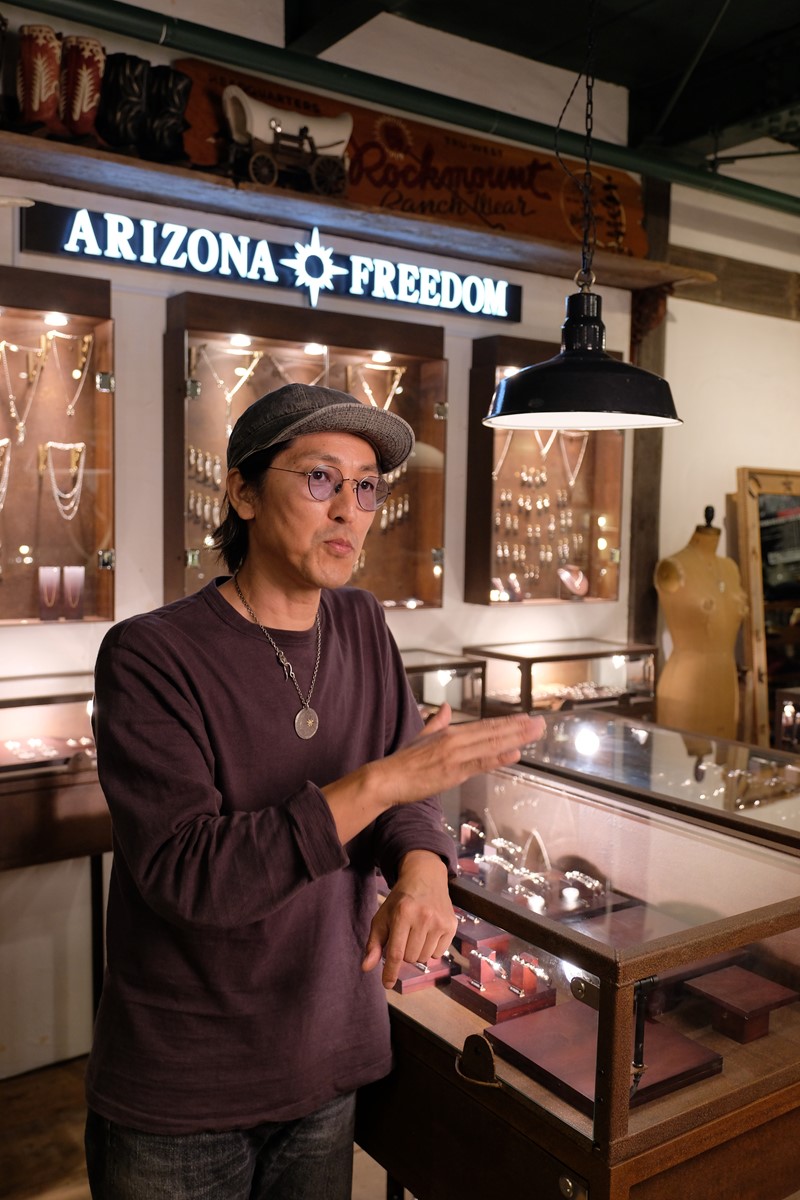店内の一角に設けられた「アリゾナフリーダム」のショーケース。「当店でも男女問わず、幅広い方に支持を受けてきたラインナップは、カップルや夫婦などのペアで着用するのも良いかと思います」とスタッフの高梨匡平さん。