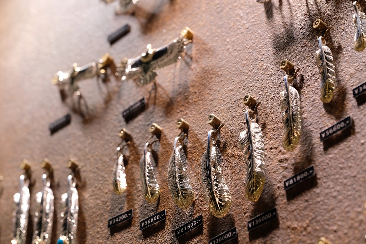 アリゾナフリーダムを代表するフェザーのペンダントトップも豊富に並ぶ。左右の羽根のデザインが存在することと、通称、先金と呼ばれるフェザーの先端にゴールドが配されたフェザーはラインナップの中でも人気のアイテムだ。(※価格は改定前の値段です)