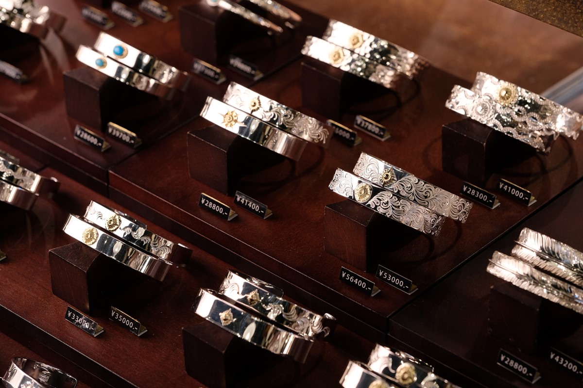 ラインナップも直営店と変わらずガラスショーケースにはバングルを始め、リングやペンダントトップなどがびっしりと並べられる。デザインもシンプルなものから、意匠を凝らしたものまで幅広く展開されている。(※価格は改定前の値段です)