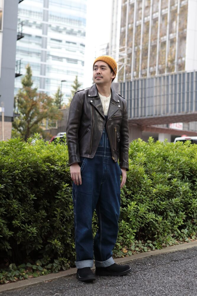 17.ワーク色を極力抑えたアーバンオーバーオールスタイル。|「FINE CREEK LEATHERS」スタッフ・有馬裕太さん