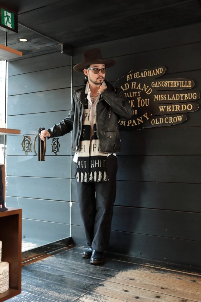 ライダースはグラッドハンドとショットのコラボで誕生した「GLADPOSTALS」。U.S. MADEらしい身幅が広めだが、GLADHAND独自のサイズ感にリサイズ。オーバーサイズの着こなしで力の抜けたラフな雰囲気に。マフラーやシャツ、ハットを合わせ、引き締めたスタイリングがポイント。
