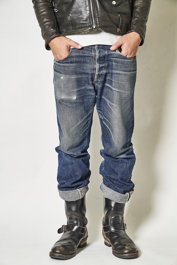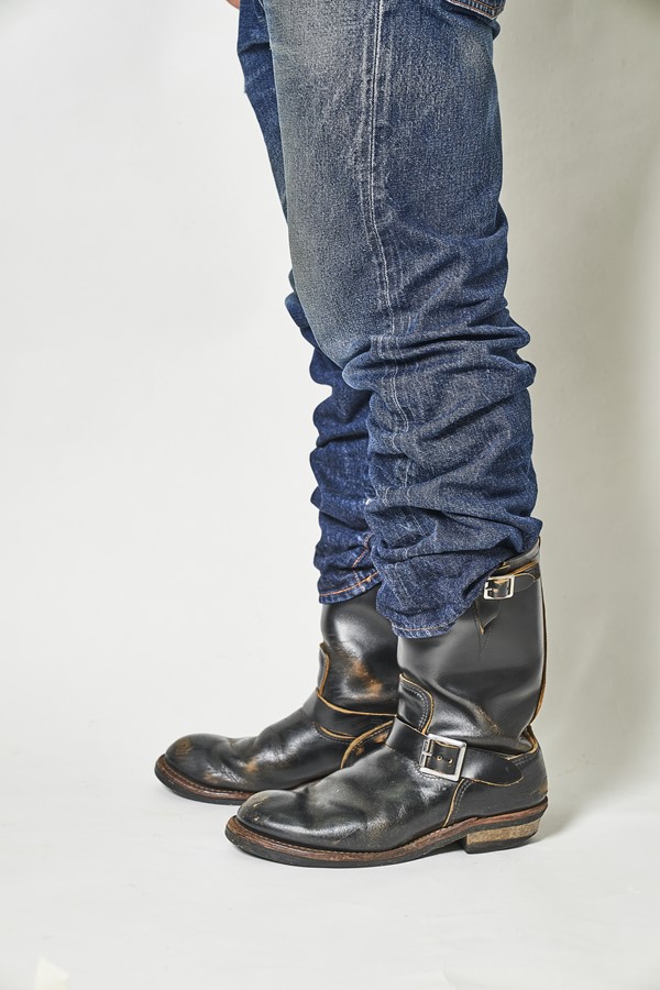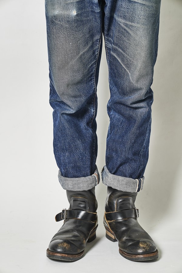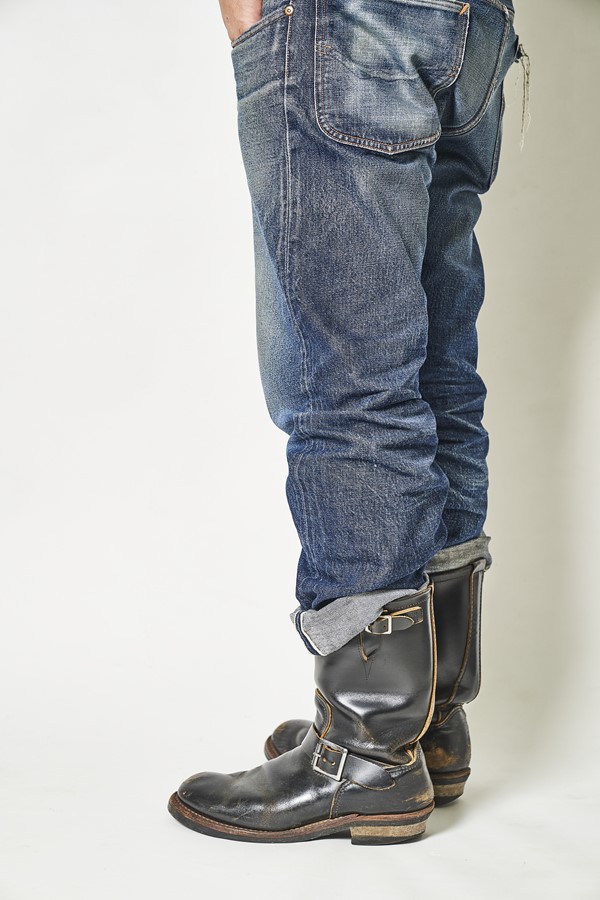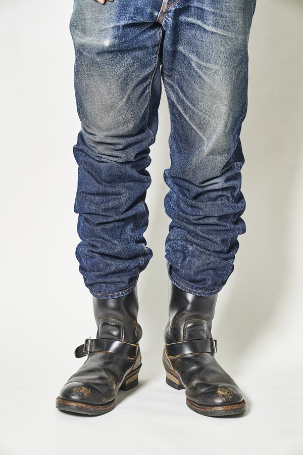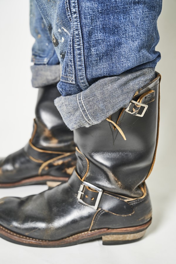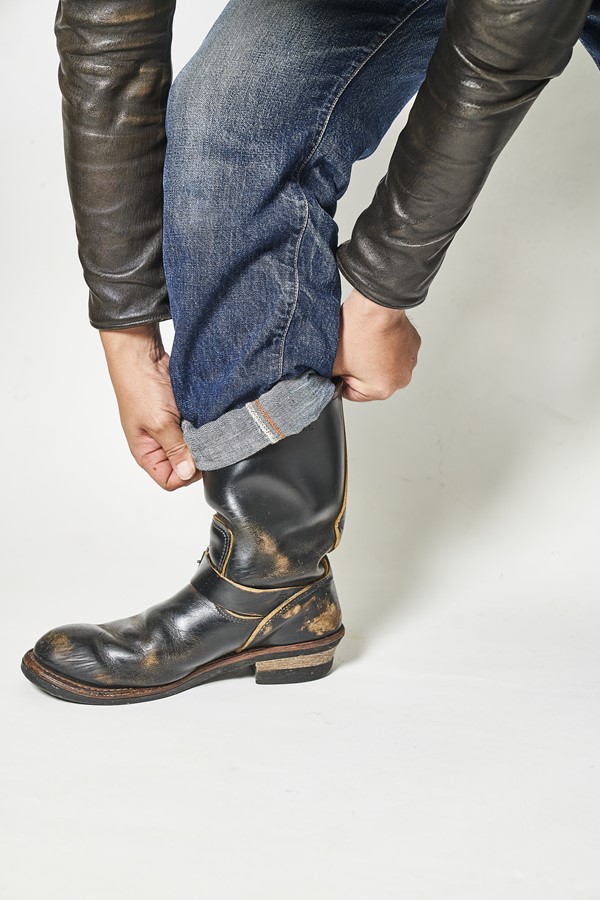 これが横から見た姿。ハングロールを横から見るとこんな感じ。ブーツを履く際に、デニムの裾がシャフトに引っ掛かってしまった……的な無造作感が出せれば完璧。スタッズなどのカスタムブーツにもハングロールは最適だ。