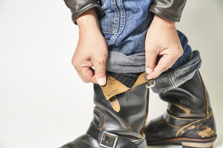 ミリタリーパンツやペインターのように、パンツが太い場合、シャフト後部に裾が引っ掛からなかったり、また見た目のバランスが悪くなってしまうことがある。そんな時は、シャフト上部のストラップを外してしまおう。これなら引っ掛けやすく、見た目のバランスも取りやすい。