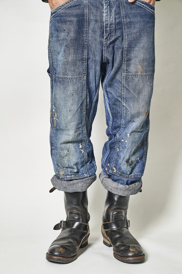 正面から見た姿。ロールアップした裾を、ブーツのシャフトに引っ掛けて作るハングロール。ブーツの存在感が増すが、膝下にたるみが若干出るため、ブーツインほどかっちりし過ぎずラフな印象を受けるのが特徴。