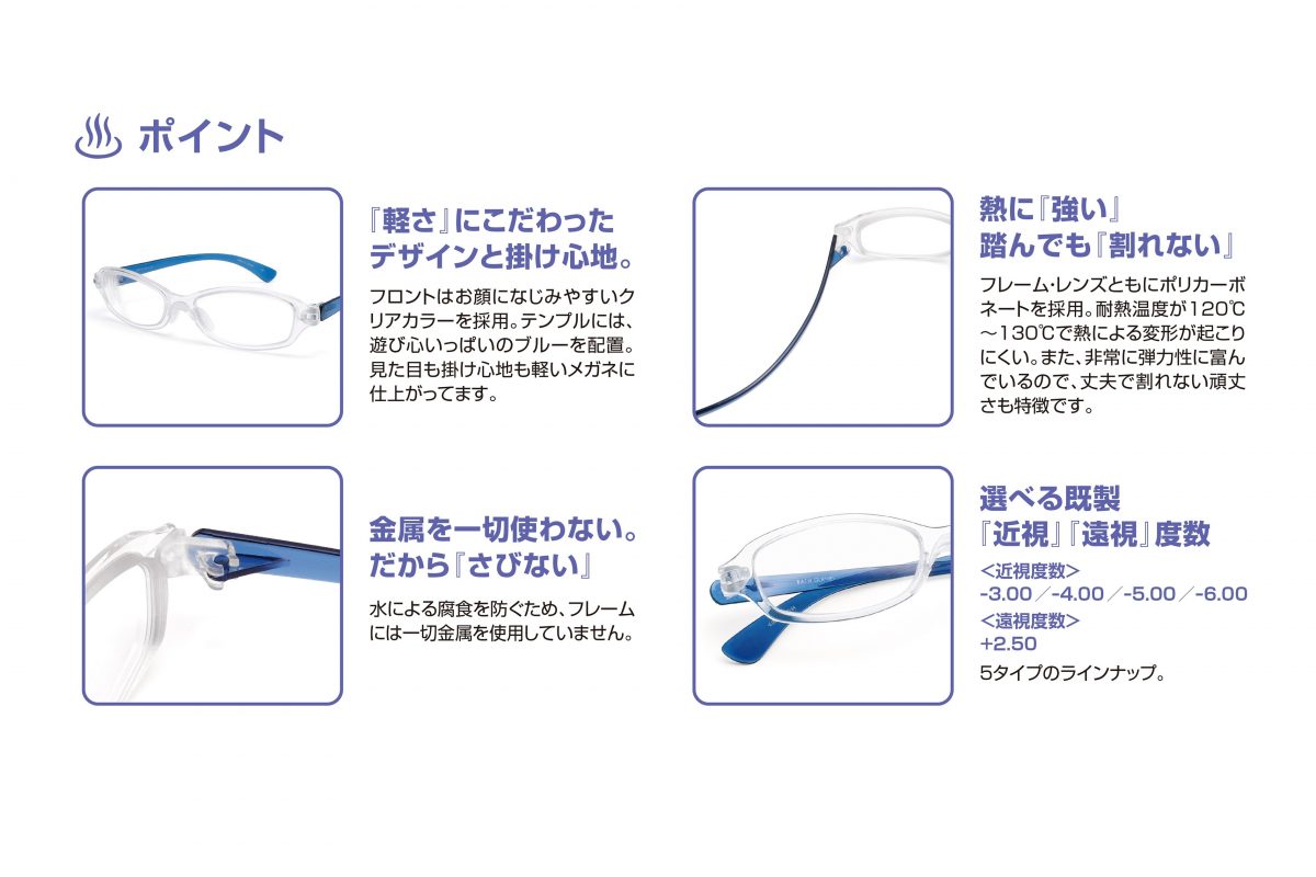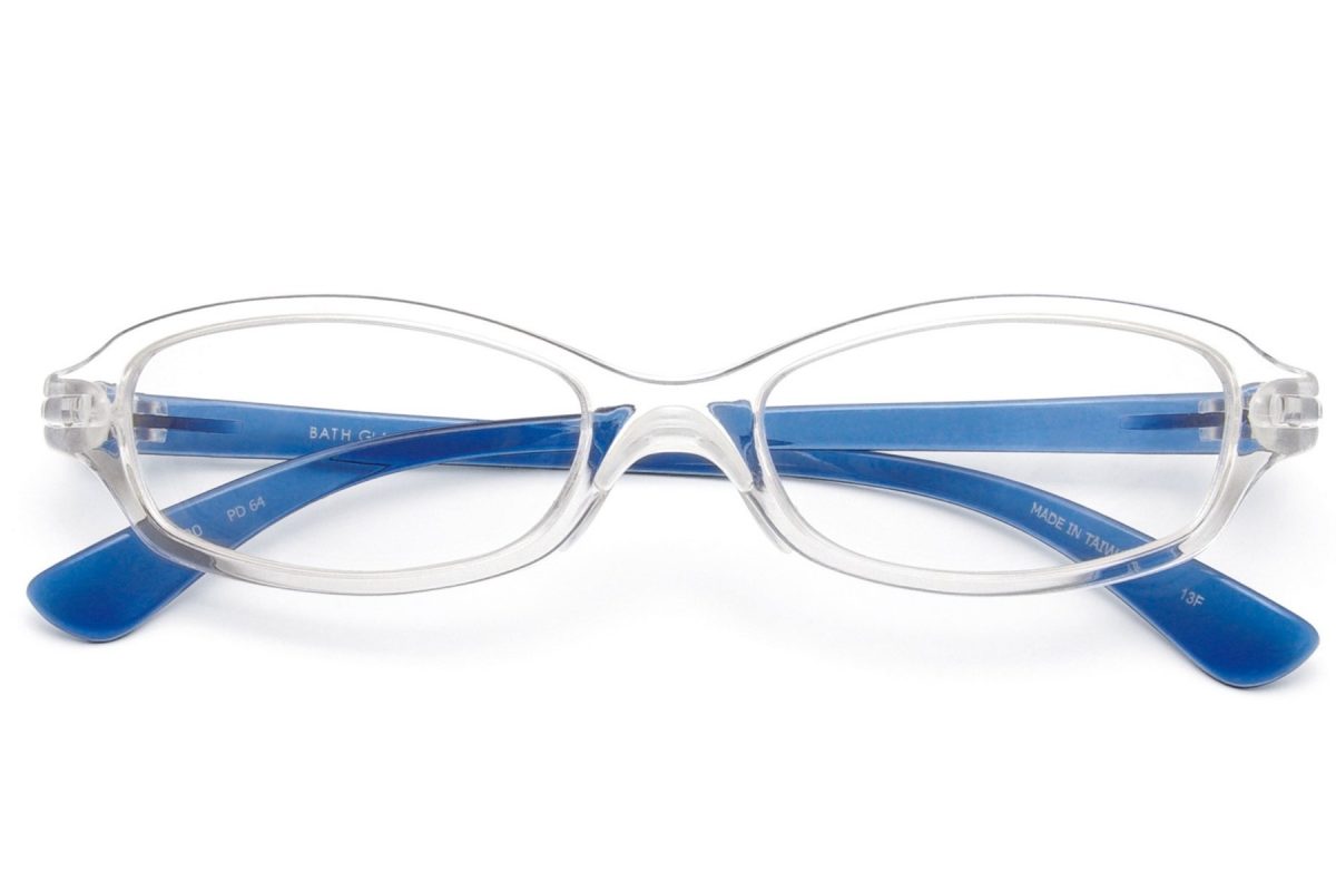 フレーム、レンズともに防弾素材にも使われるほどの強度を備えている樹脂素材のポリカーボネートを採用。数あるプラスチック素材の中でも軽量で弾力性も備えているため、着け心地は快適だ。耐熱温度は120~130度とサウナでもOK! 変形しにくく、フレームにはネジ類などの金属を一切使用してないので水や熱による錆びや劣化にも強い。フロントは透明なので顔の印象を変えず、テンプルはブルーにしたことでお風呂場でも見つけやすい。レンズには防曇コーティングを施しているので、脱衣所から浴場への移動もスムースだ。