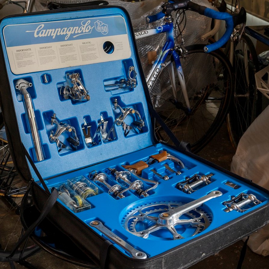 完品で揃うのが嬉しいファン垂涎の限定品。イタリアのロードバイク専用パーツメーカー、カンパニョーロ50周年のアニバーサリーセット。完品での相場観は70万円前後。大変人気があり、パーツ単体で取引されることも多い。