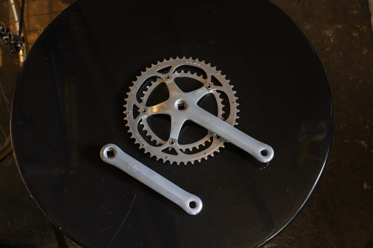 イタリアンバイクの絶頂期のデザインとハンドクラフトの特有の味わいを同時に楽しめる「Cレコード」のクランクセット。状態の良いもので8万円前後から見つかる。