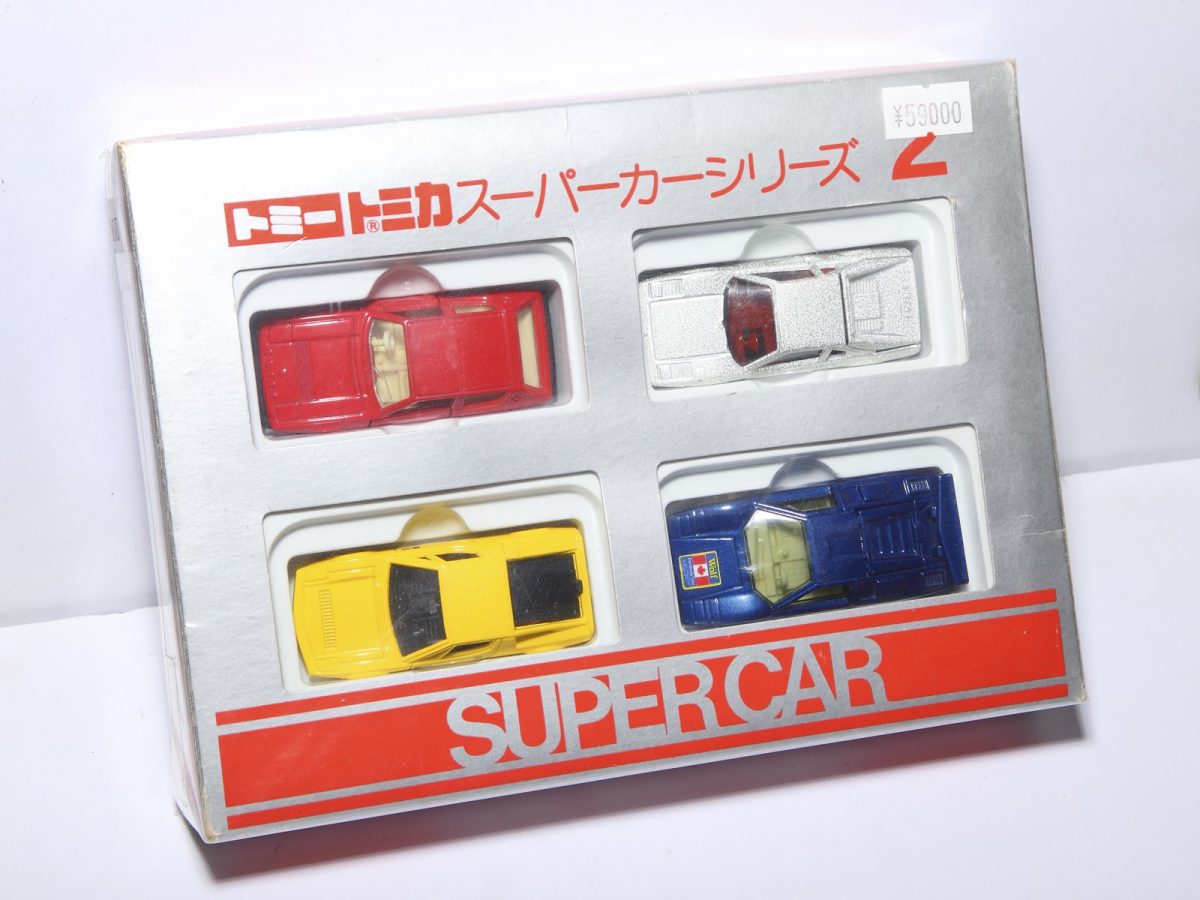 スーパーカーブームの頃に登場したギフトセット。通常シリーズでは販売されていないカラーリングのフェラーリやランボルギーニなど4種類の高級車が入っている。販売当時は960円だったが、現在は6万円ほど。