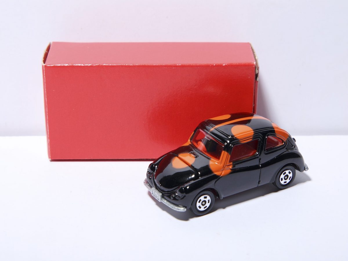 数種類のカラバリが販売されたスバル 360。中でも非常に珍しいのが水玉模様の装飾を纏った通称:てんとう虫。通常は赤×黒コンビが一般的だが、こちらは、世に出回らなかった幻の試作品で20万円以上。