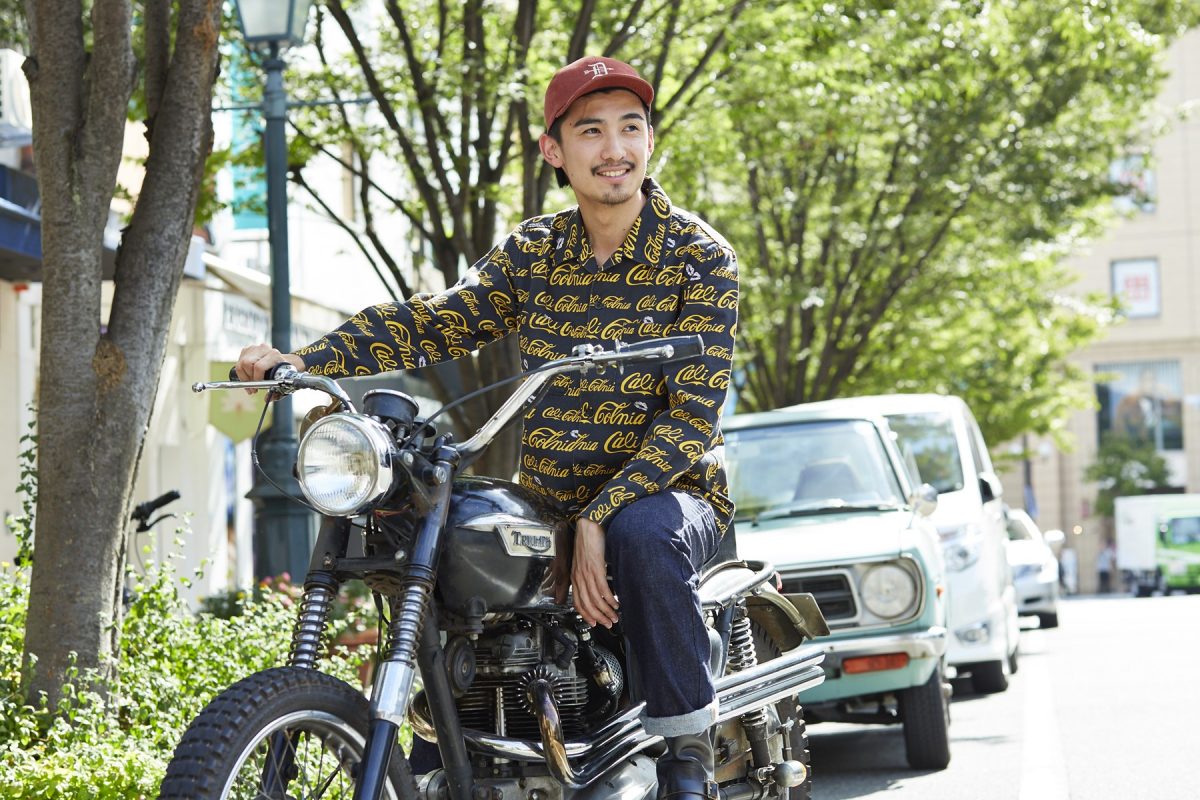 オープンカラーの総柄シャツを主役に王道のアメリカンカジュアルのスタイルは、軽快な印象のTR-6スクランブラーにぴったりの爽やかな着こなし。秋口はインナーとしても重宝する。