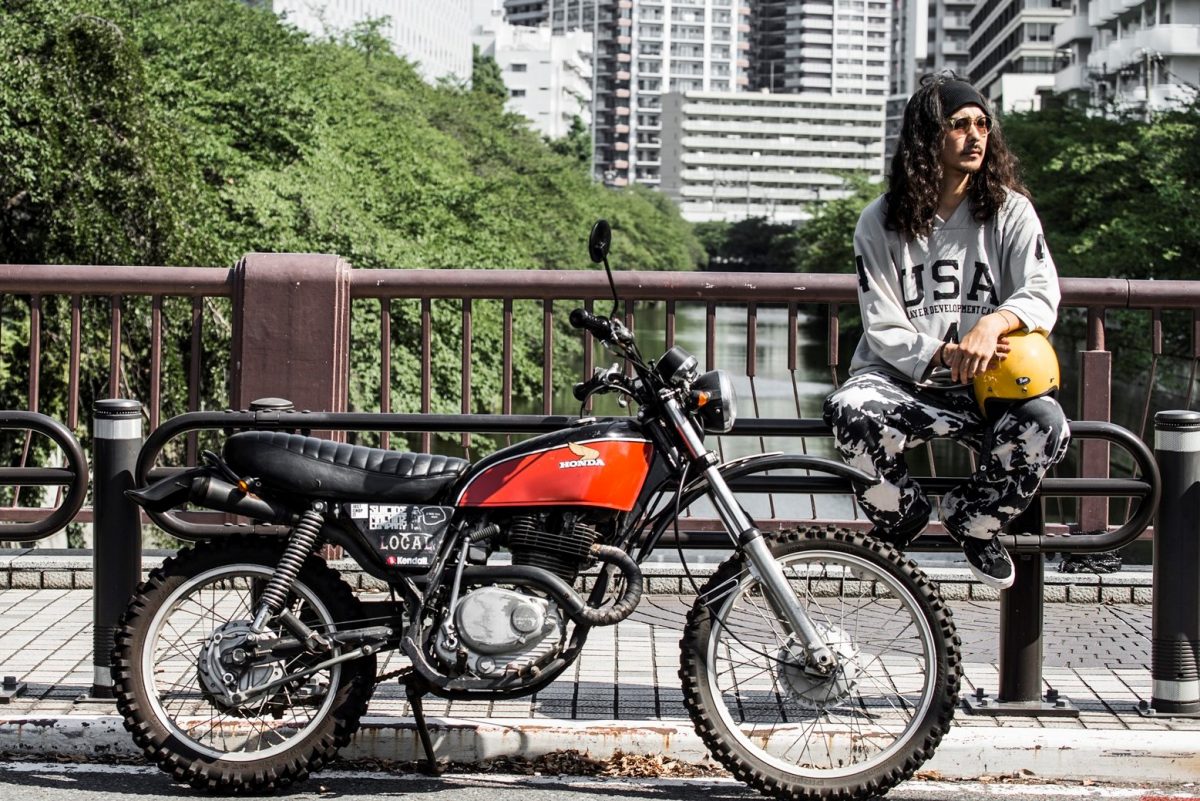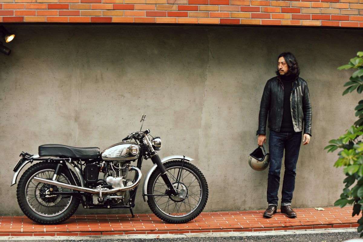 スクランブラー黎明期のモデルだけにロードバイクの要素が色濃く残る一台。「専用フレームや21インチホイールなど、きちんとオフロード仕様で作っている部分にメーカーの信念を感じます」と石嶋さん。王道のコーディネイトもサイジングでキレイ目に。