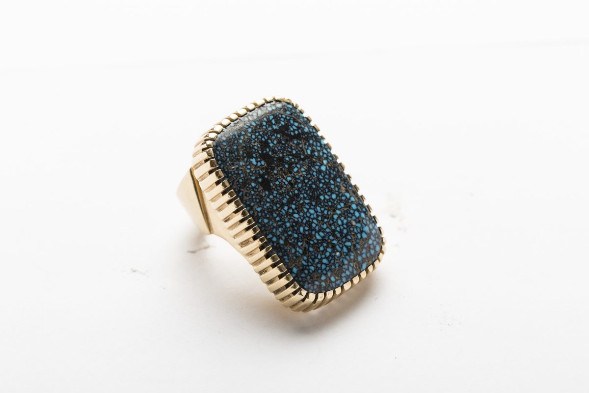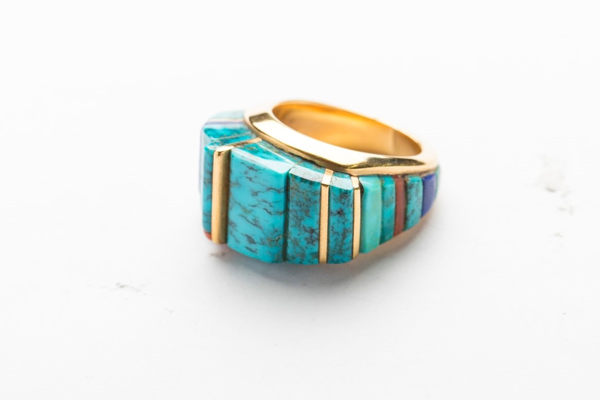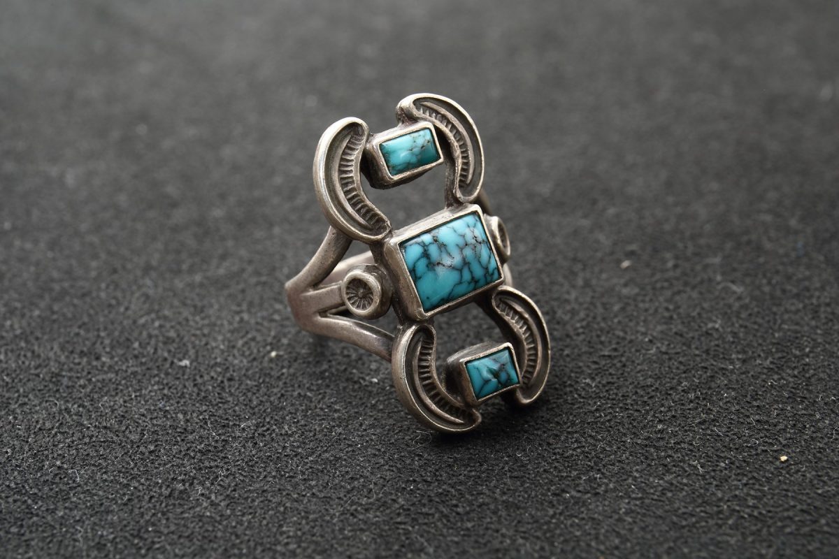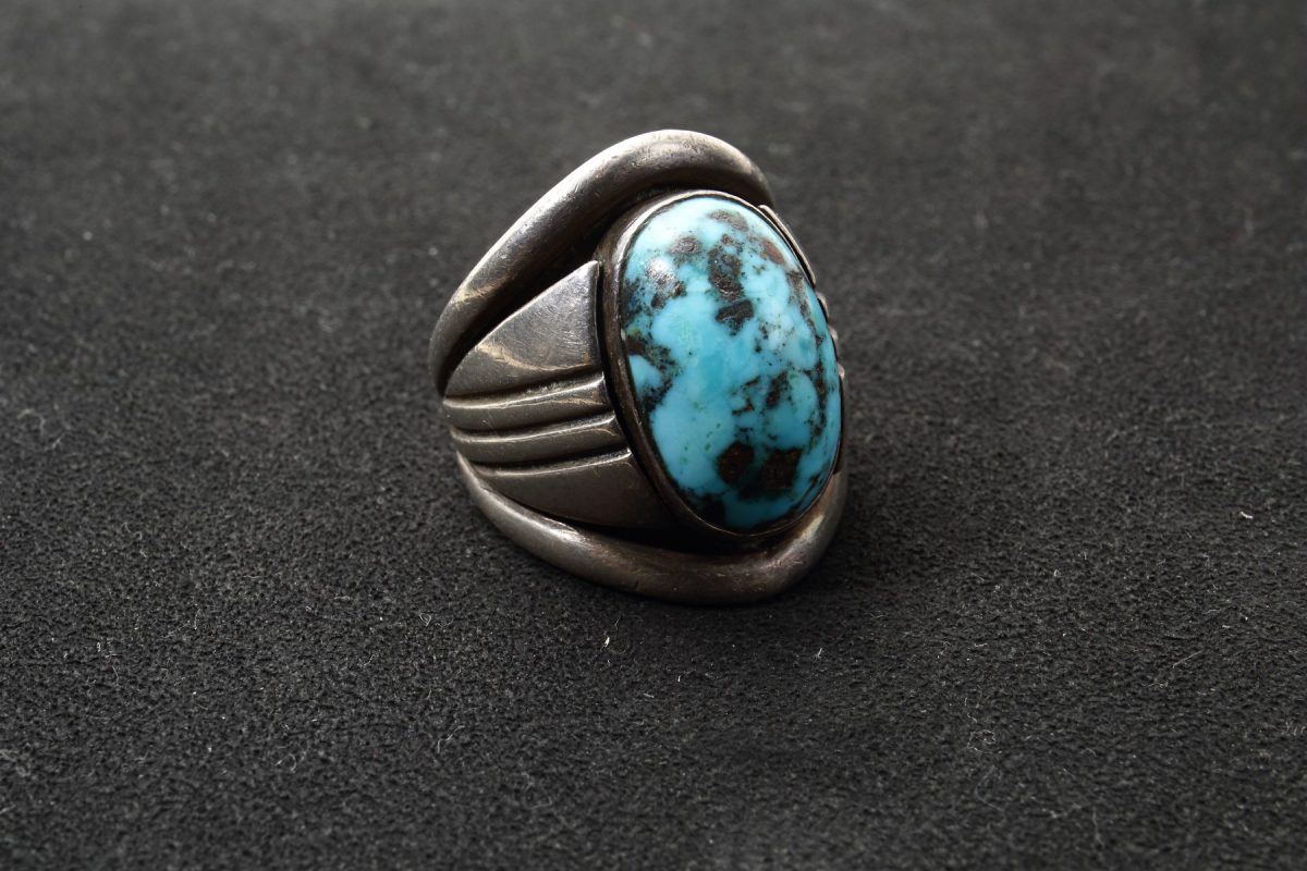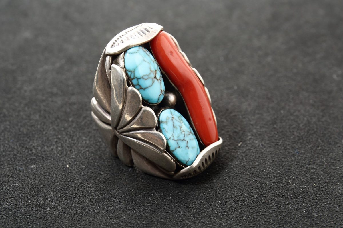 1921年生まれのナバホ族の巨匠。2002年に他界。’30年代より名門として知られるトレーディングポスト『トーブターペン』で働き、‘70年代頃に独立。ターコイズとレッドコーラルを組み合わせたリング。(スカイストーン・トレーディング)