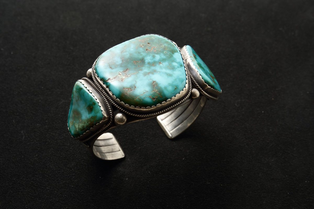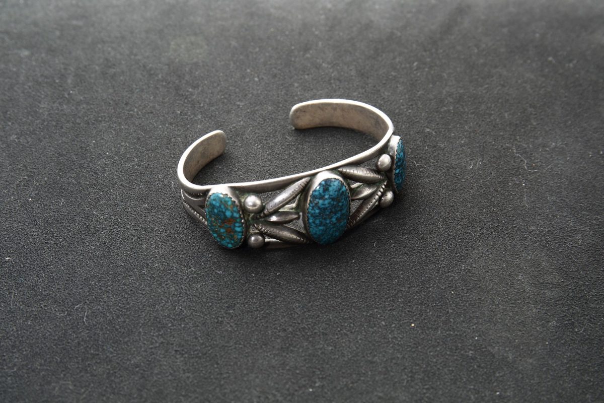 大人気アーティストであるシピー・クレイジーホースの父親でもある超が付く有名作家。リビングレジェンドであるジュリアン・ロバートと同じサンダーバードショップ出身。大きなブルージェムのバングル。(スカイストーン・トレーディング)