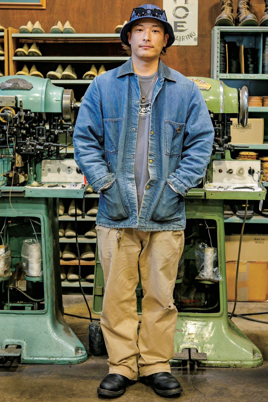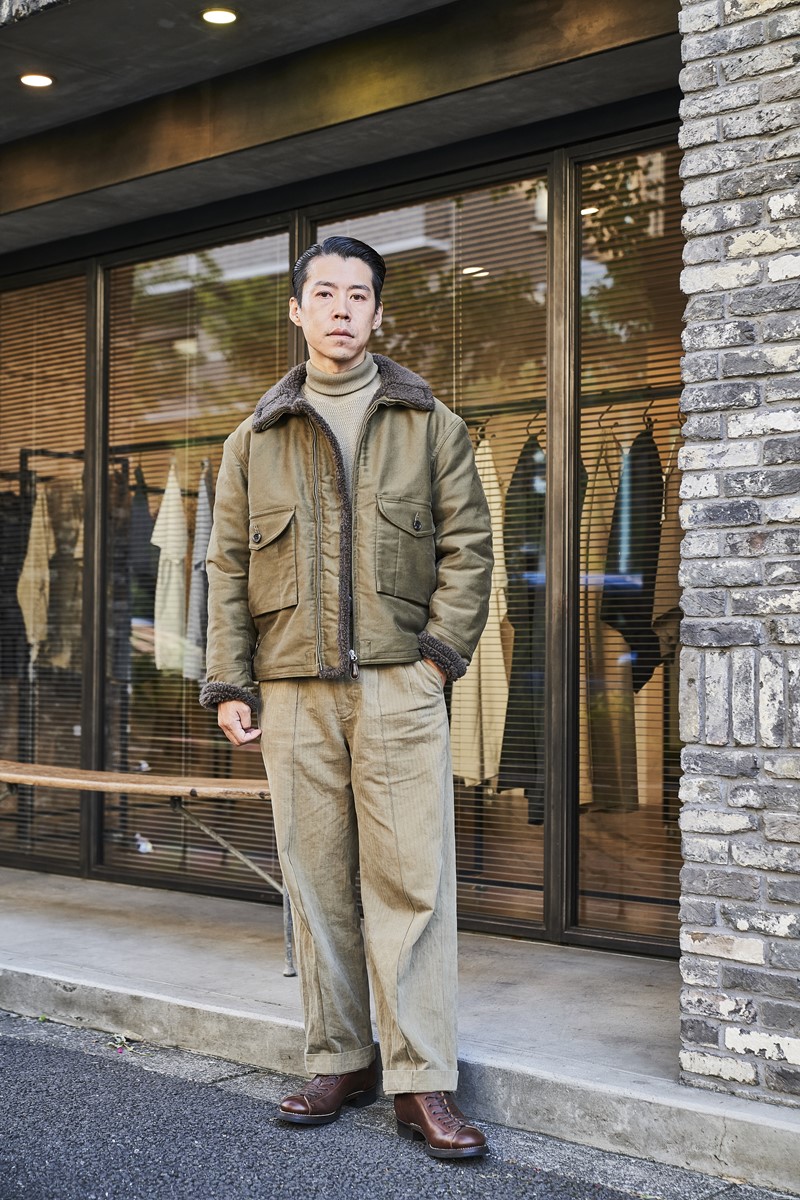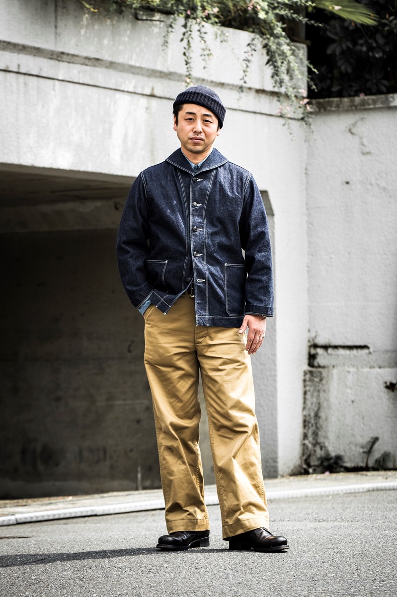 デニム×チノのシンプルなスタイルだが、’40sのU.S.Nをベースとしたカバーオールをはじめ、全身ミリタリーモチーフのアイテムで統一。ラフに成りすぎないようにシャンブレーシャツをインナーに取り入れている点もポイント。