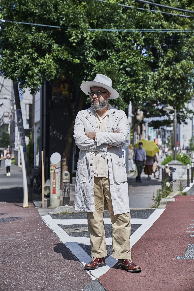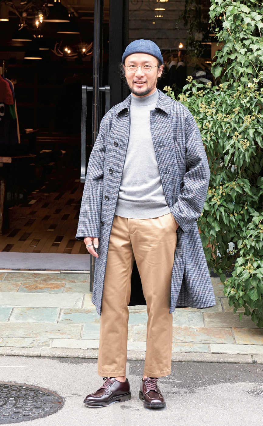 秋冬シーズンには欠かせないと語るザファットハッターのブリムハットで登場してくれた菊地さん。ハットやシューズは上品なものをチョイスしながらも、オールドクロウのコートでワイルドな風味をプラス。ブライスランズのチノも◎。