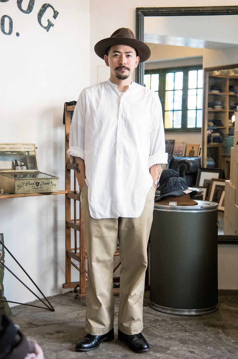 マオカラーシャツはフランス製のヴィンテージで、ボトムスにはチノトラウザースの銘品として知られるU.S.ARMYの極太41カーキを合わせた。全身ヴィンテージでも清潔感のあるスタイルはお手本にしたいところ。