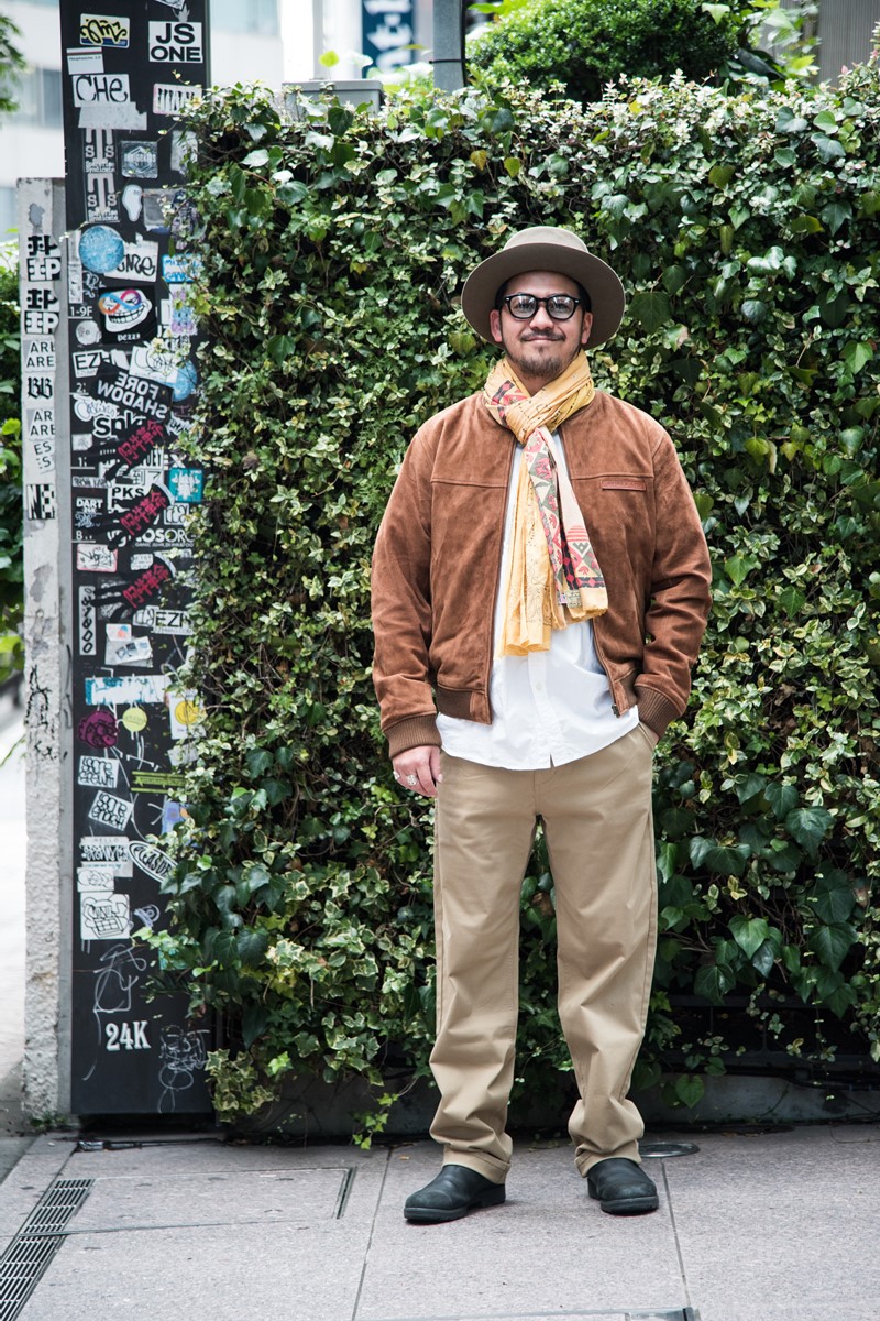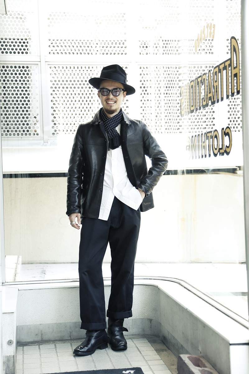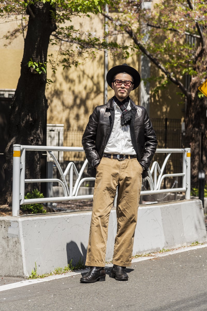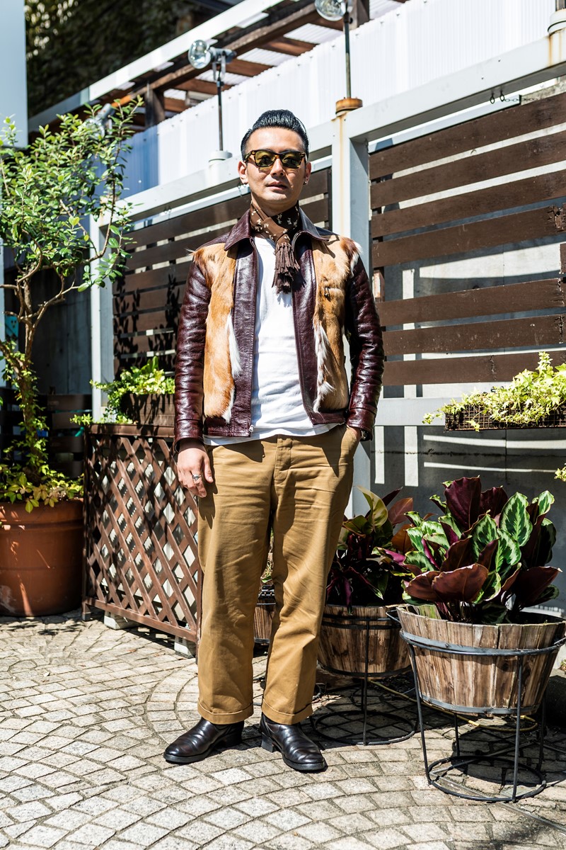 ホースハイドのハーフコートを使ってカジュアルとドレスの中間的な雰囲気にまとめた竹本さん。全体的に無骨なアイテムチョイスだがスカーフを取り入れて上品な雰囲気を演出している。ウエアマスターズの黒チノパンを合わせ、レザーをキレイに着こなすお手本のような着こなし。