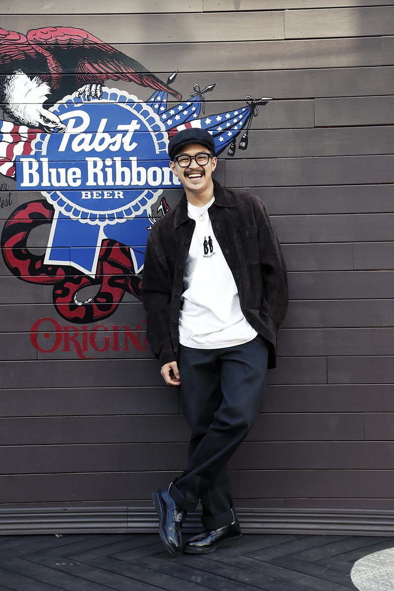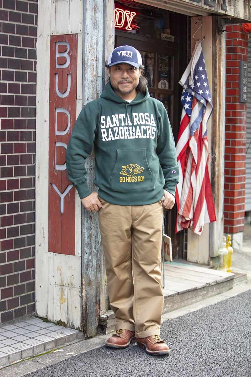 「ワーク×スポーツMIX」コーデで登場の望月さん。派手なカレッジプリントはBUDDY別注のチャンピオン・リバースウィーブ。そこにウェポン生地を使用したBUDDY別注のベンデイビスのチノパンをチョイス!