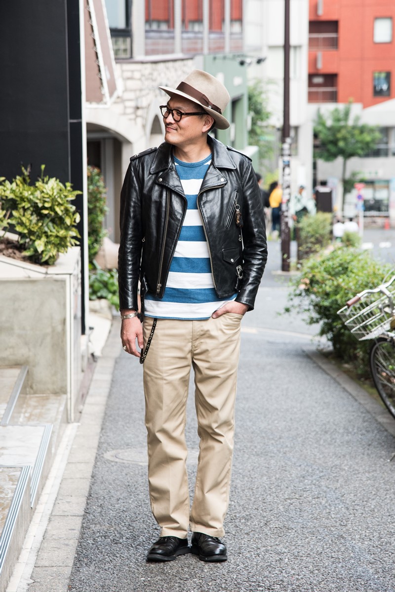19.ショットのライダースにはデニムでなくチノパンを選択。