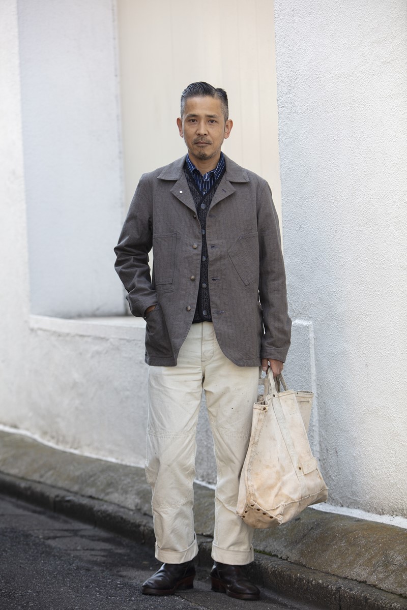 エイジングによって風合いが増したカバーオールと、チノパンをメインにしたワークスタイル。マットブラックのブーツが全体の印象を引き締め、重厚感も加わる。ゆったりしたボトムスゆえ、大人の余裕も感じさせる佇まいに。