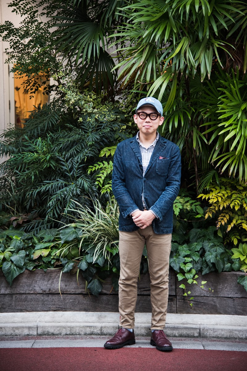紺ブレ、チノパンで作るエヴィス流アイビースタイル。インディゴジャケットはジャストサイズで着用するため、袖にデニム特有の美しい色落ちが見られる。全体的ににタイトなシルエットがすっきりとした印象に。