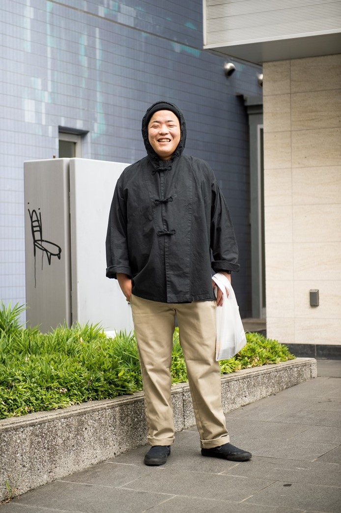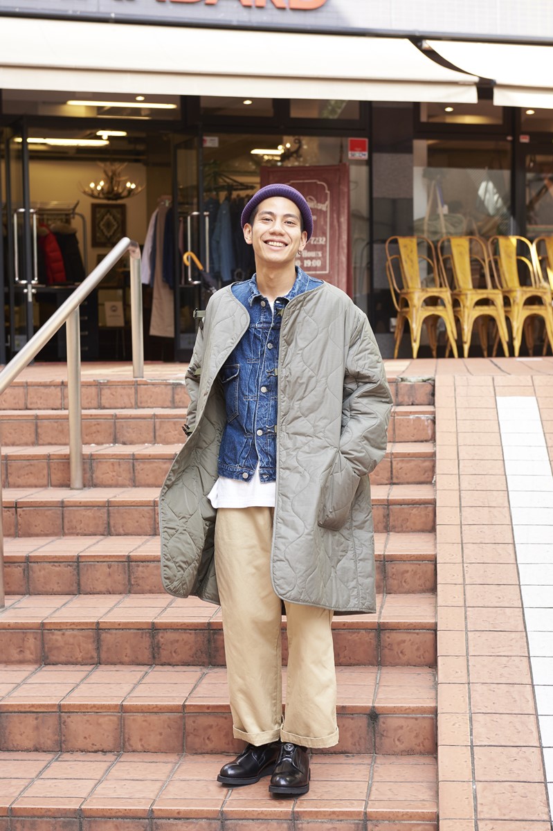 ミリタリーのライニングをモチーフにしたオーバーサイズのジャケットのチョイスがお見事。デニムジャケット×チノパンというベーシックな組み合わせでも、このジャケット1枚でグッと個性的なスタイリングになるのだ。