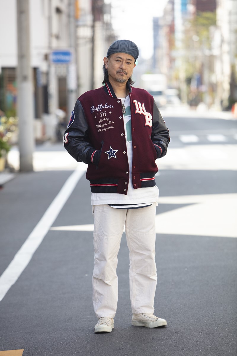 フルデコレーションされたホッケーチームのアワードジャケットを主役にするため、インナーやパンツ、シューズを白で統一。大き目なサイズ感をスタイリングに取りいれ、やぼったさのあるこなれ感も演出している。