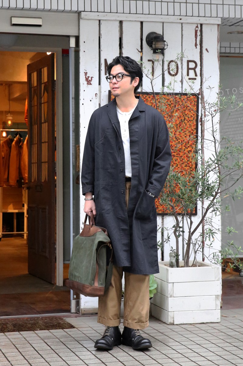 モーターの新作であるブリテッシュレイルコートを中心に組んだコーディネイト。モーターのチノトラウザーに、ヘンリーネックをパンツインしたことで、ほどよく上品な印象に。パンツ丈を短くすることでコートとのバランスを考慮。