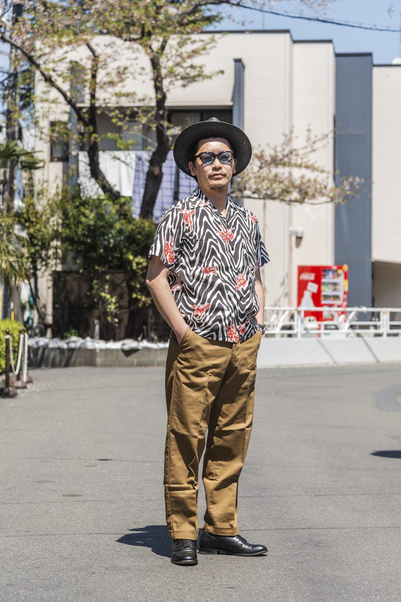 レーヨン素材のオープンカラーシャツは、活躍度大。トップスはタイトなシルエットでもパンツに緩さをもたせることでバランスの良いコーディネイトに。「ジャストに着用したシャツとゆとりのあるシルエットのパンツが気に入っています」