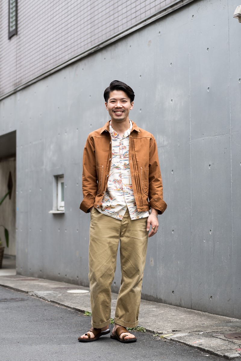 柄に独特の強さがあるアロハシャツをインナーに入れ込む事で、個性的かつ夏っぽさを感じさせる春のスタイルに。また袖をロールアップすることで、腕周りのアクセサリーを活かしつつ、足元にはサンダルをチョイスするなど、小技の効いた雰囲気に仕上げている。