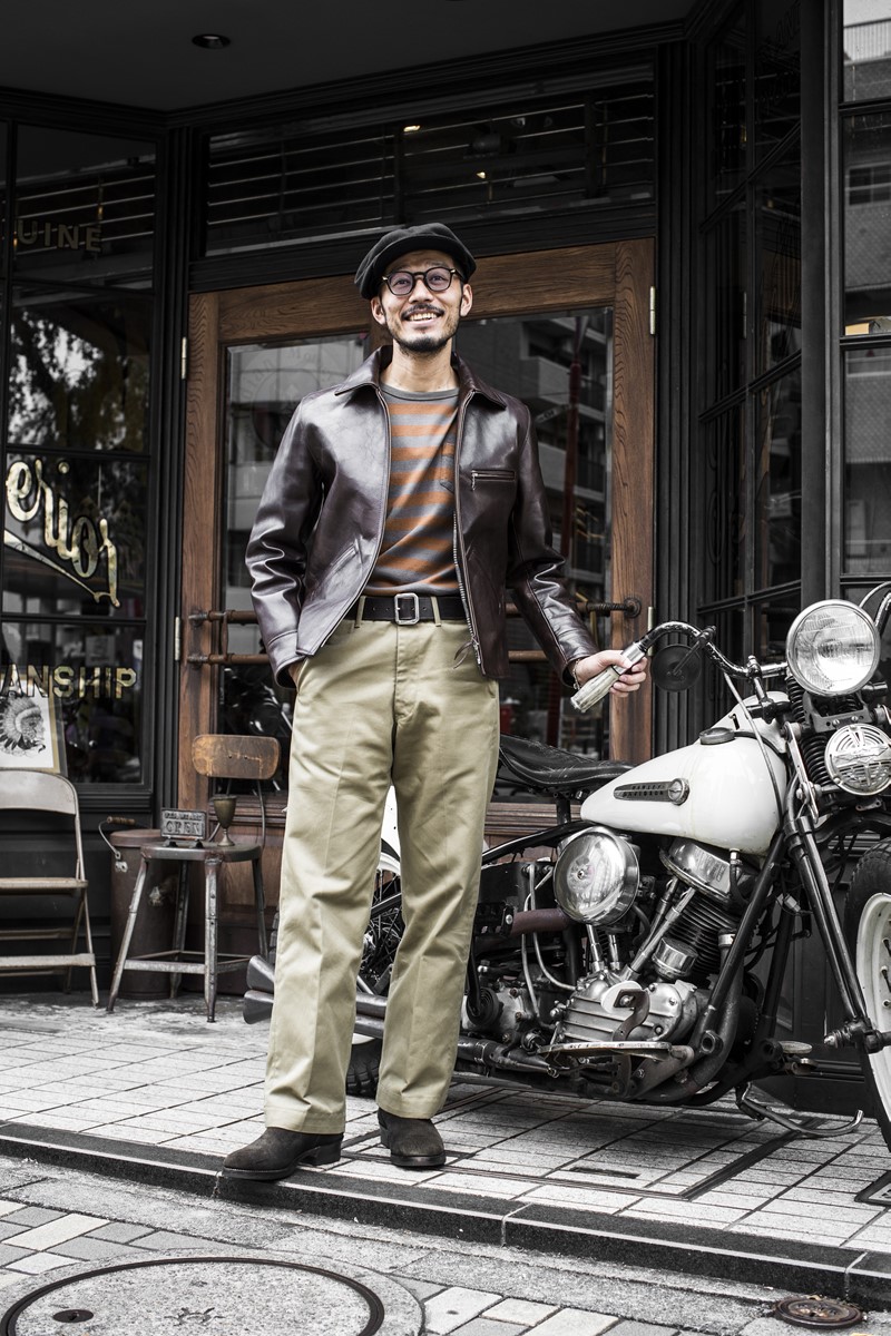 手染めのホースハイドを使用した直営店別注のスポーツジャケットを主役に、全身を茶系のカラーリングで統一したクラシカルなレザースタイル。トロフィークロージングのクラシカルなデザインのチノパンは存在感あり。すべて天然素材のアイテムで構築した着こなしがヴィンテージバイクによく似合う。