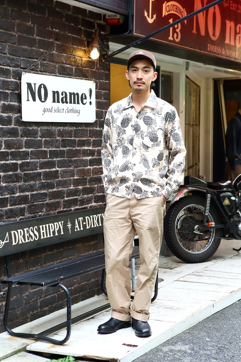 ルーディーな印象の長袖総柄シャツを軸にスタイリング。ピンストライプ調のパイナップルを全面にちりばめたトロピカルデザインが好印象。秋には1枚で主役、寒くなればインナーとして取り入れても存在感を発揮できるはず。
