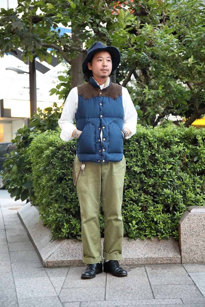 ホワイトのオックスフォードシャツに、ほどよい色落ちのデニムのダウンベストで清潔感のある爽やかなコーディネイト。安心感のあるインディゴとホワイトの組み合わせはカジュアルスタイルの定番。パンツにはオリーブのチノトラウザースをセレクト。シューズやアクセサリーを使ってバランスよくヴィンテージをミックスさせることでアクセントとなっている。